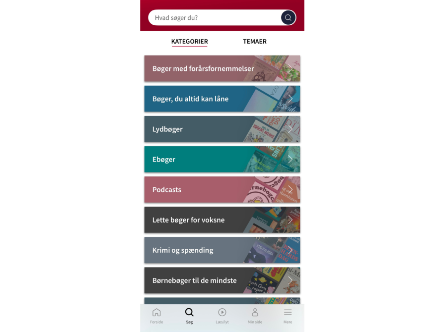 Ønsker du at gå på opdagelse i alle vores blå titler, kan du trykke på "Søg" i bundmenuen. Her finder du alle eReolens inspirationssider, og på siden "Bøger, du altid kan låne" anbefaler vi de bedste og nyeste blå titler. Scroller du ned i bunden af denne side, kan du også få vist en samlet liste over alle eReolens blå titler.